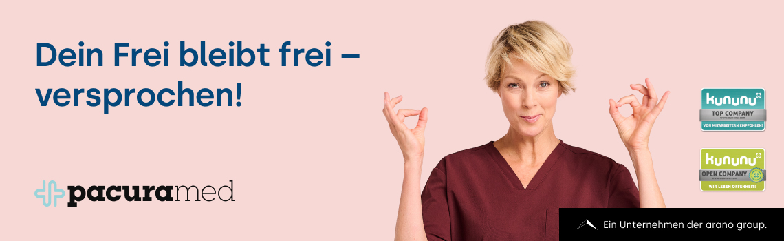 Bei Pacura med bestimmst Du Deine Arbeitszeiten selbst. Deine freien Tage gehören Dir und auch Dein Urlaub richtet sich nach Deiner Planung - nicht nach einem knappen Dienstplan. Neben einem festen Gehalt bieten wir Dir spannende Fort- und Weiterbildungen sowie einen ganz persönlichen Ansprechpartner, der immer für Dich da ist.